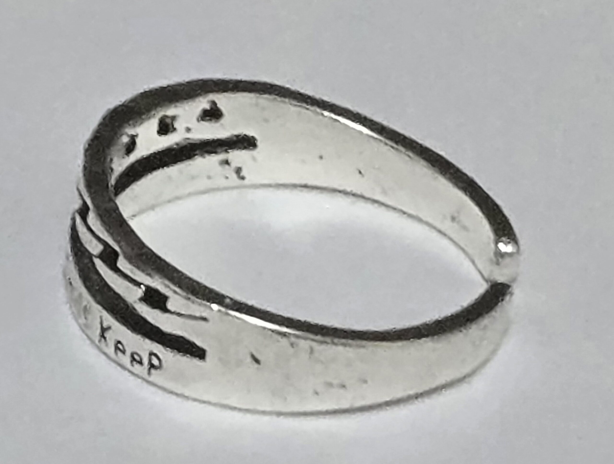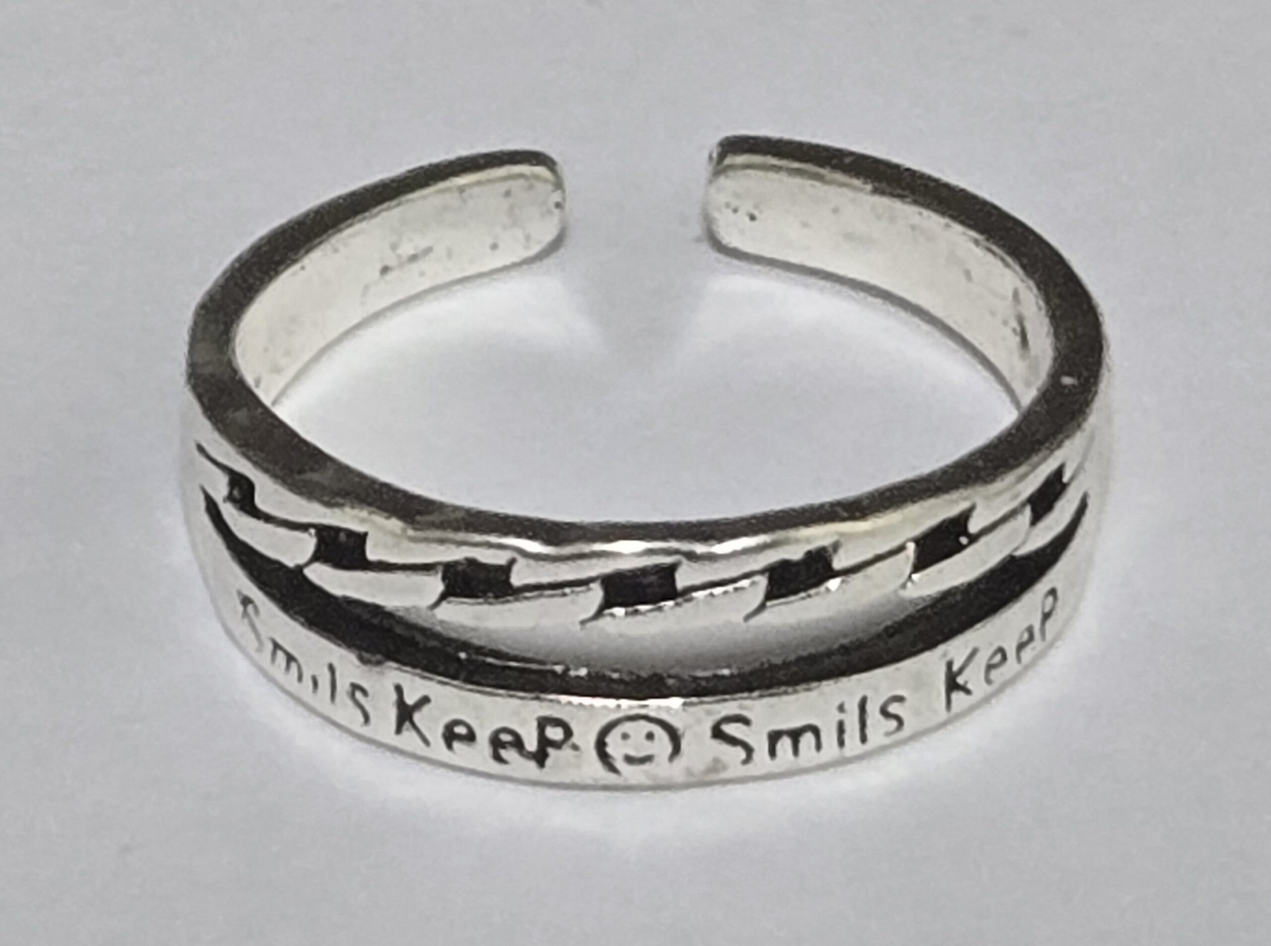 這款優雅的刻字銀戒,大小為日本標準尺寸4號,表面經過精心打磨,刻有「Smils Keep」的細緻字樣,象徵著保持微笑、積極向上的生活態度與堅韌不拔的精神。戒指本身的設計厚實而不過於張揚,使其不僅佩戴舒適,更具有耐久性,無論是單獨佩戴展現簡約美,還是與其他飾品巧妙疊戴,都能完美融入並提升您的個人風格。