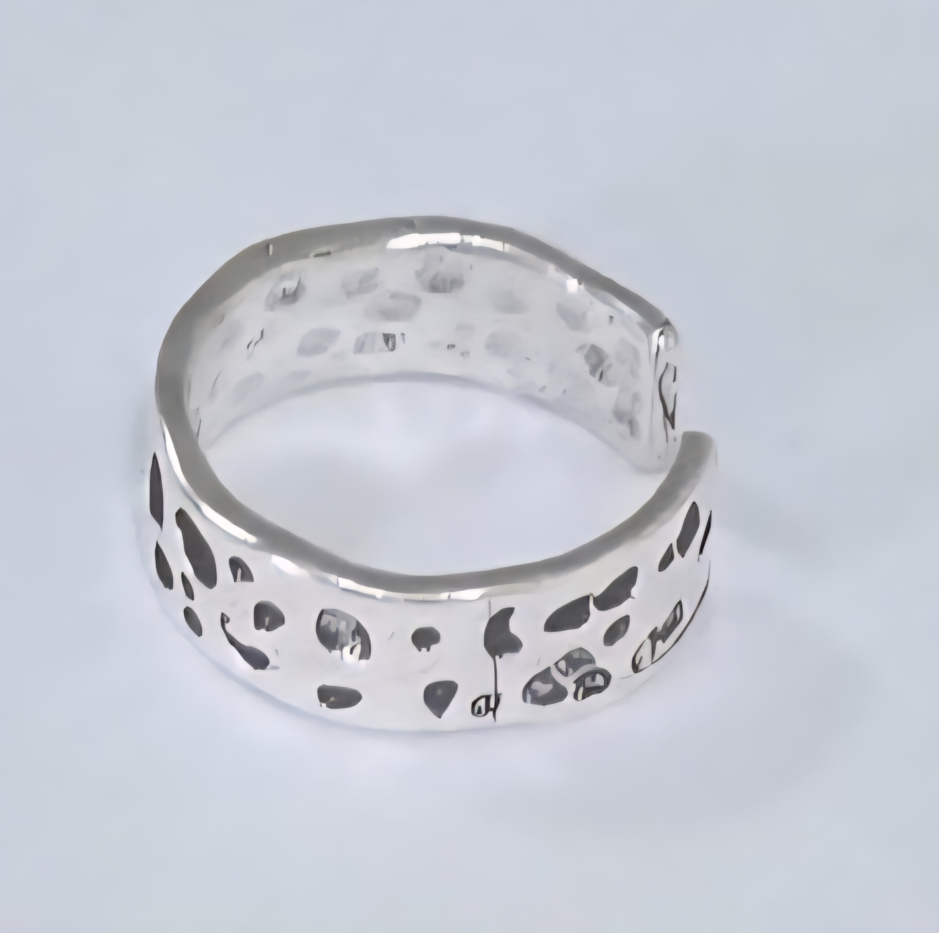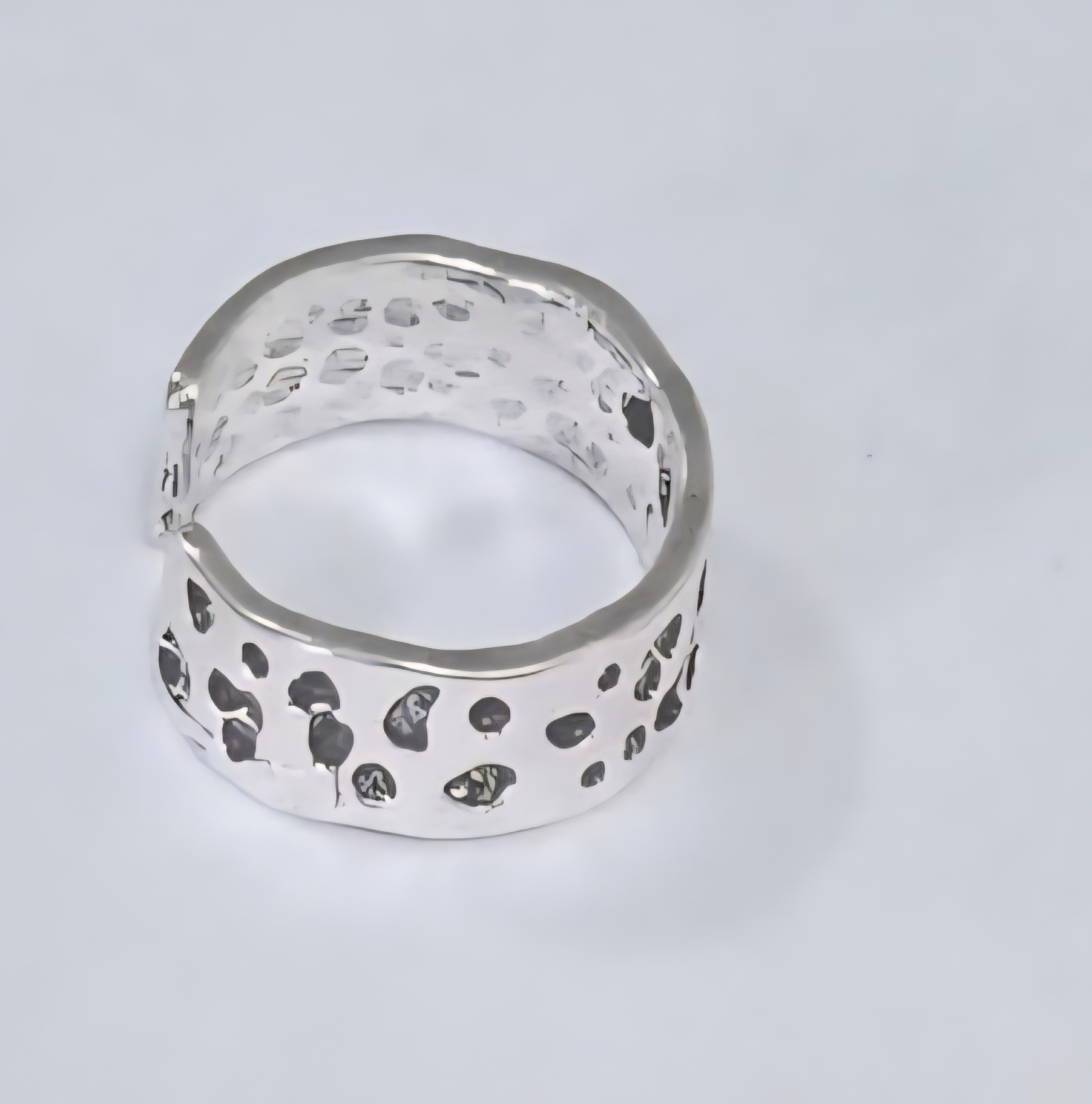 這款戒指的設計獨具匠心,大小為日本標準尺寸4號,採用了引人注目的不對稱孔洞造型,呈現出一種流動而富有想像力的現代藝術感。每一處孔洞的切割都精準俐落,使得光線能夠穿透其間,創造出獨特的光影效果。它非常適合那些熱愛前衛時尚、追求個性化表達的你,能為您的整體造型瞬間注入一股不凡的藝術氣息,展現您與眾不同的品味。